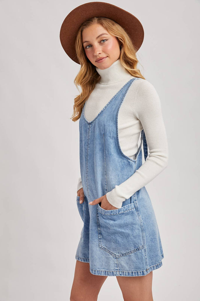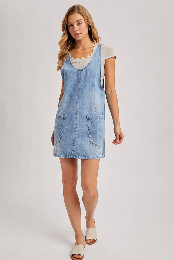 This denim washed overall-style dress features a deep scoop-neckline at the front, with wide shoulder straps. The dress has a distinct A-line silhouette, flaring out slightly from the waist to a mini-length hem that falls above the knees. Key details include two large, prominent patch pockets on the front of the skirt portion. There's also a visible vertical seam running down the center front of the dress. The denim has a classic, slightly faded look, suggesting a comfortable, worn-in feel. It's styled as a layering piece, worn over a long-sleeved top in the image.
