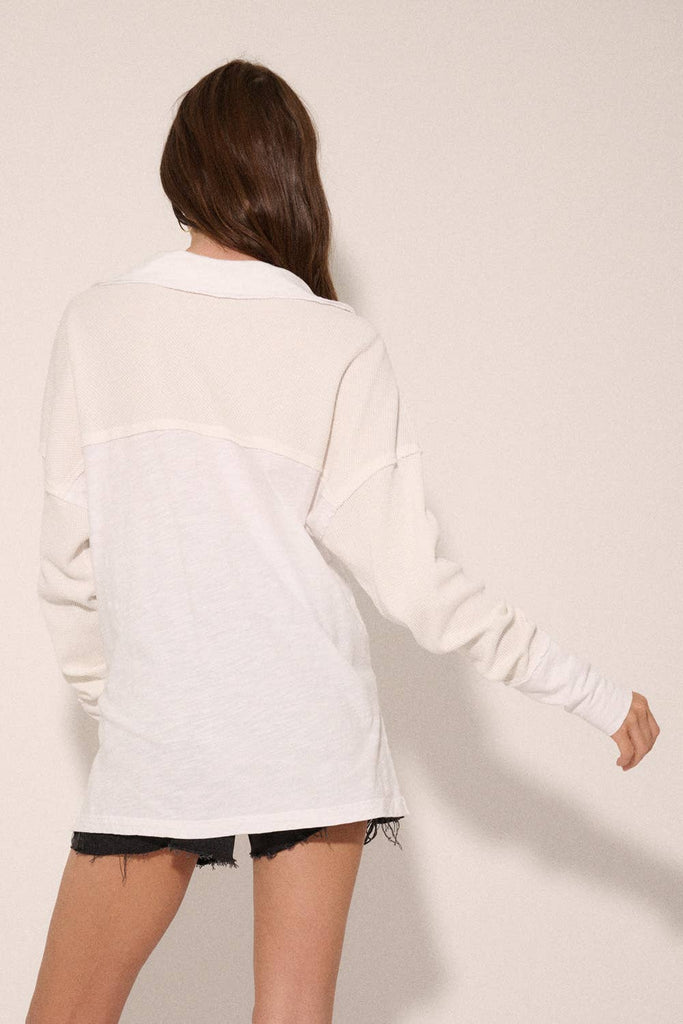 Contrasting mineral washed slub knit and waffle knit fabric panels.