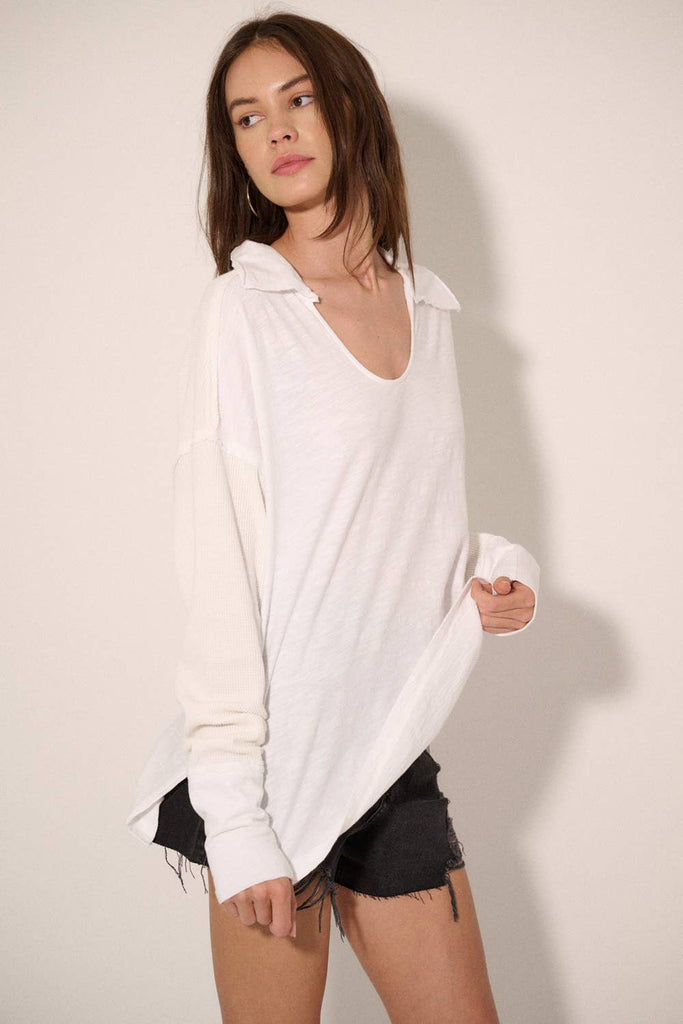 Mixed Media Slub Knit Collared Scoop Neck Top