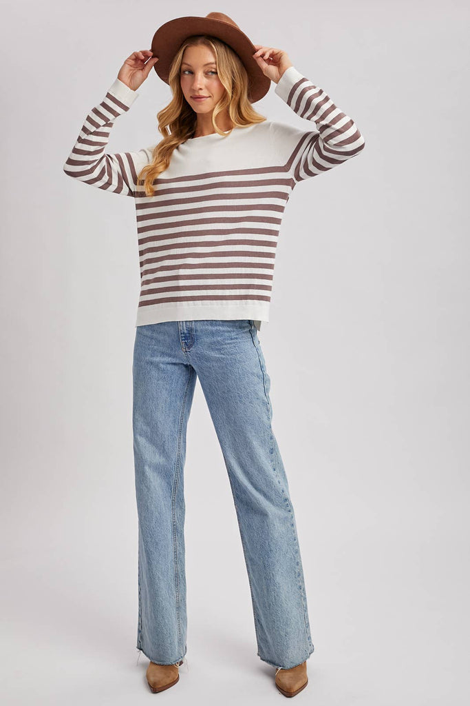 A striped knit overall top with a boat neck design is a charming and versatile piece. The top features a stylish boat neckline, offering a sophisticated and sleek look. The striped pattern adds a touch of classic elegance, while the side slits enhance comfort and style. It's a modern, chic choice suitable for various occasions, complementing different bottoms for a fashionable ensemble.
